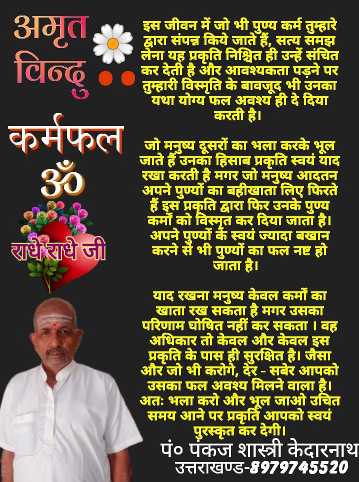 National Uttarakhand अपने पुण्यों का खुद बखान करने पर नष्ट हो जाता है पुण्य का फल ukadmin April 21, 2023 1 min read news Tags: shubh prabhat Continue Reading Previous आज का राशिफल: पं. राजेन्द्र प्रसाद जी (पंकज शास्त्री) केदारनाथ (देवभूमि उत्तराखण्ड) हिमालय।Next मुखबा से गंगोत्री के लिए रवाना हुई मां गंगा की डोली, कल खुलेंगे धाम के कपाट Leave a Reply Cancel replyYour email address will not be published. Required fields are marked *Comment * Name * Email * Website Save my name, email, and website in this browser for the next time I comment. More Stories 1 min read National Uttarakhand अभाविप राष्ट्रीय अधिवेशन प्रांगण में लगी भव्य ‘रानी अब्बक्का प्रदर्शनी’ का आचार्य बालकृष्ण ने किया उद्घाटन November 27, 2025 ukadmin 1 min read National Uttarakhand इसरो के पूर्व अध्यक्ष एस. सोमनाथ होंगे अभाविप के 71वें राष्ट्रीय अधिवेशन के मुख्य अतिथि November 27, 2025 ukadmin 1 min read National Uttarakhand आज का राशिफल … आचार्य आशु जी November 27, 2025 ukadmin
