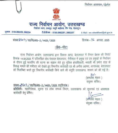 14 अगस्त को बेतालघाट में ब्लॉक प्रमुख चुनाव के दौरान गांव में फायरिंग की घटना हुई थी। चुनाव आयोग ने आज इस पर कार्रवाई की।