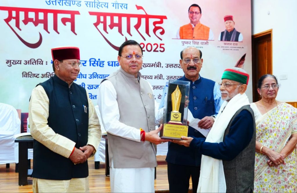 उत्तराखंड साहित्य गौरव सम्मान समारोह में मुख्यमंत्री पुष्कर सिंह धामी ने साहित्यकारों को सम्मानित किया। वरिष्ठ रचनाकारों को मिला ‘दीर्घकालीन उत्कृष्ट साहित्य सृजन पुरस्कार’। बीस रचनाकारों के साथ ही एक पत्रिका को भी मिला सम्मान।
